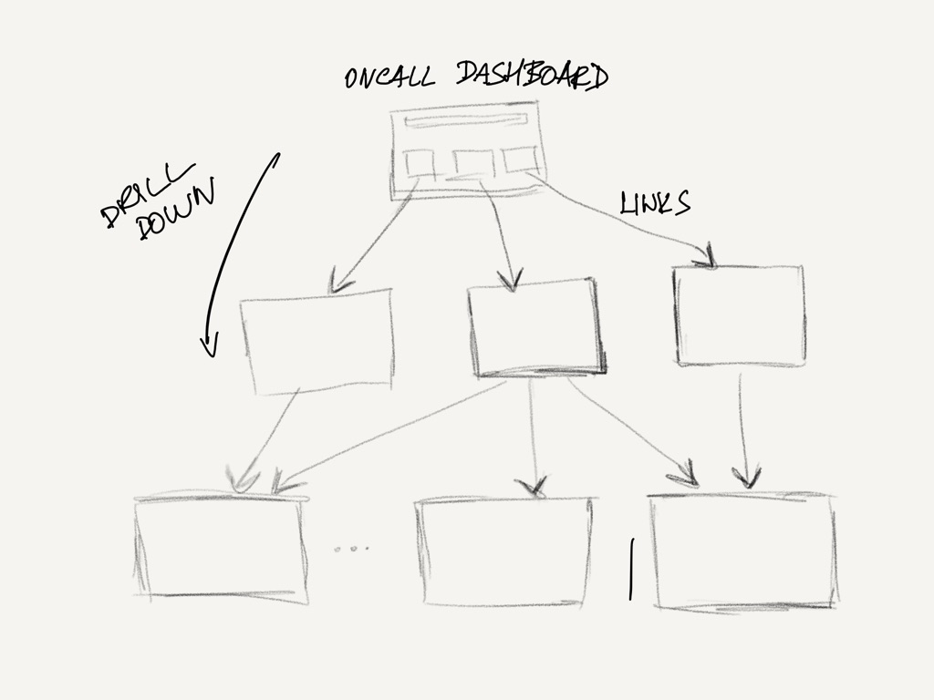 What is a drill-down strategy? It means that you have a central dashboard with overview as a single point of contact for your oncall engineers and then there are more detailed dashboards linked from the central dashboard.